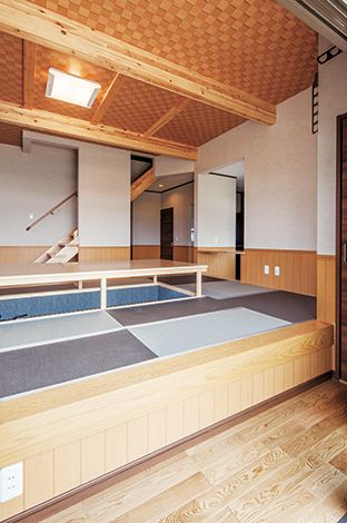 小上がりのldスペースは畳の床 畳は ダイケン畳 清流 11 銀鼠色 を使用 掘りごたつ式のダイニングスペースに ラワン無垢材のテーブルを設置 掘りごたつ内は床をカーペットにして 柔らかい床に 吹抜けのldスペースはおよそ22畳ほどの空間で 天井高もあるため